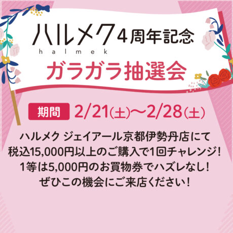 日頃のご愛顧に感謝を込めて、ハルメクジェイアール京都伊勢丹店では4周年記念の特別企画を開催いたします。期間中は、税込15,000円以上のお買い上げで「ハズレなし」のガラガラ抽選会にご参加いただけます。